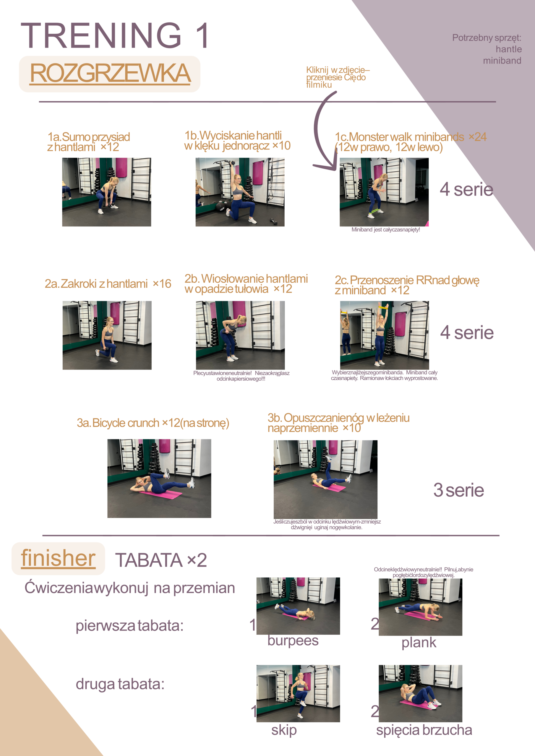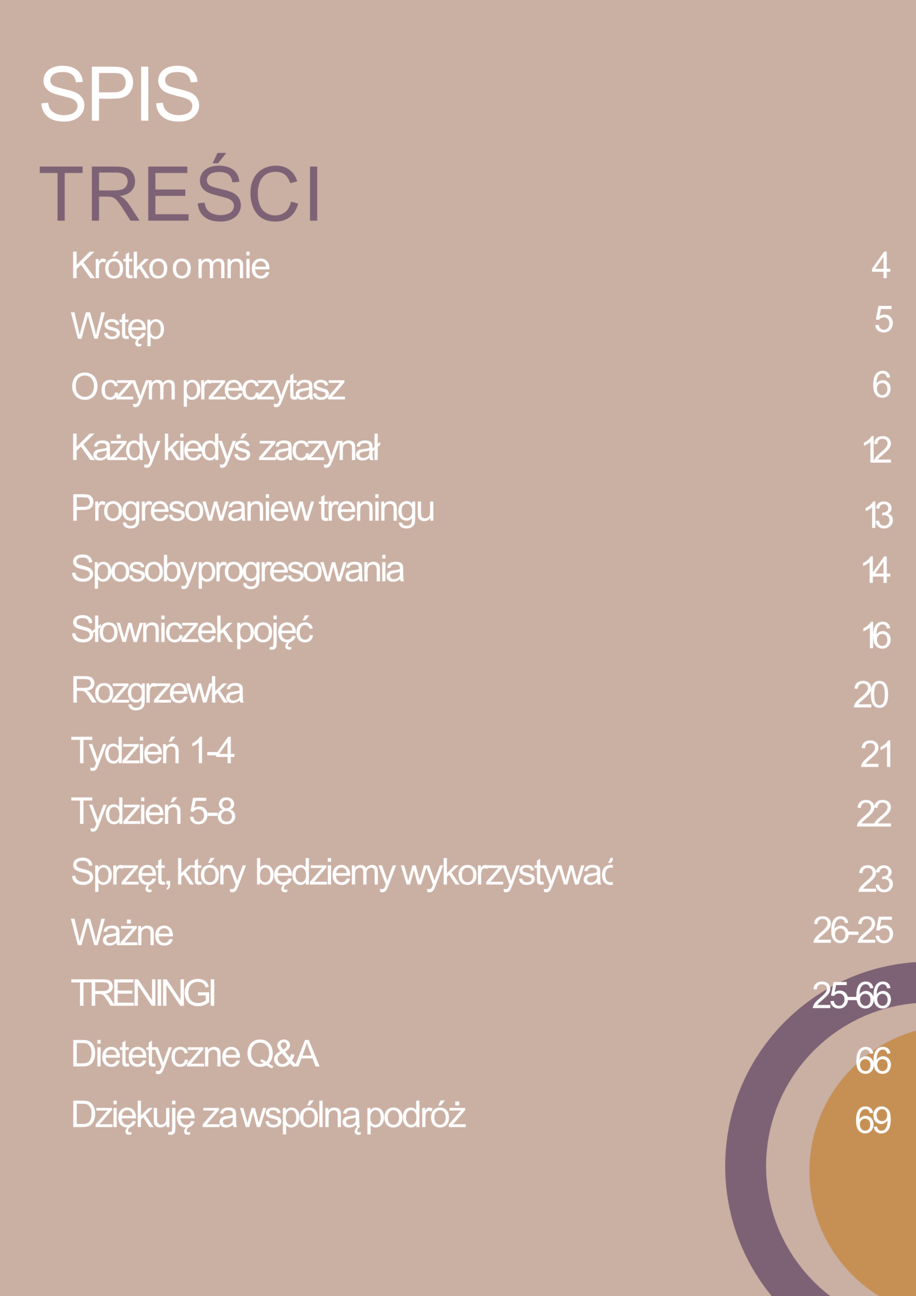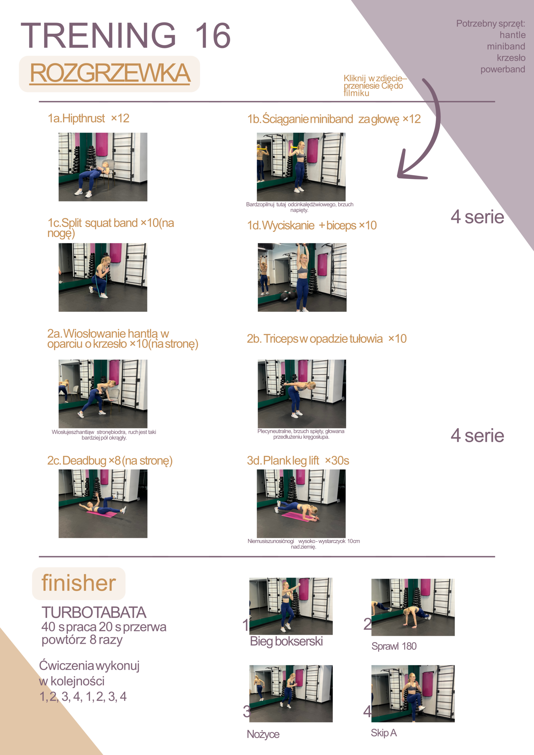 Plan jest przygotowany pod domowe warunki i uwzględnia potrzebny sprzęt (np. hantle, gumy, krzesło) przy treningach. W e-booku dostajesz też słowniczek pojęć oraz rozdział o progresowaniu, a dodatkowo strony „Notes” do zapisywania i sekcję „Dietetyczne Q&A”. Przy ćwiczeniach są klikane materiały wideo ułatwiające wykonanie.